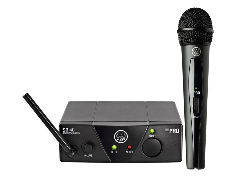 AKG WMS40 Mini Vocal ISM1: Ruční bezdrátový systém ze série WMS40, který je skutečným „plug’n’play“ bezdrátovým řešením a poskytuje křišťálově čistý zvuk. Je připraven k použití během jedné sekundy a operuje na frekvenci 863.100 MHz, poskytujíc optimální řešení pro malé pódia, kluby, menší bohoslužby, hotely a posilovny. Systém zahrnuje stacionární přijímač SR40 Mini a přenosný ruční vysílač HT40 Mini s kapsulou dynamického mikrofonu.