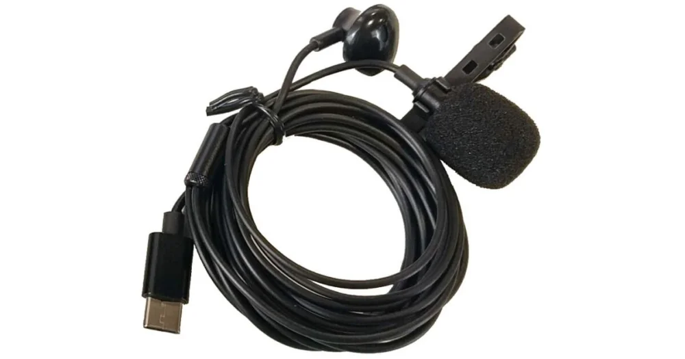klopový kondenzátorový mikrofon se sluchátkem, USB-C konektor pro připojení k notebooku, počítači nebo chytrému telefonu, kovový úchyt pro uchycení na klopu, délka kabelu 290 cm
