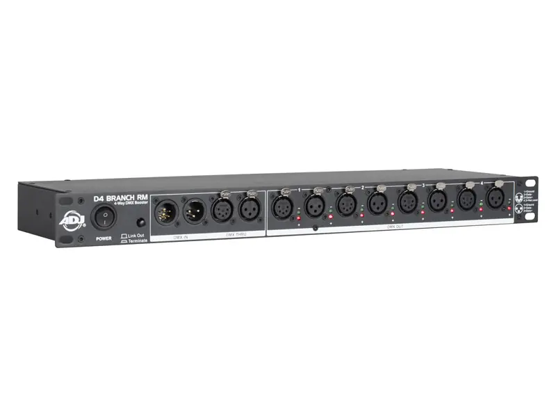 D4 Branch RM je 4kanálový splitter/booster DMX linky do racku, výška 1U. Jednotka rozděluje jeden vstupní DMX signál na 4 výstupní elektricky izolované a zesílené linky. Výstup DMX Thru umožňuje pokračování DMX linky do dalšího splitteru. Pokud DMX linka nepokračuje do dalšího splitteru, lze ji ukončit tlačítkem Terminate. Všechny vstupy a výstupy jsou v provedení 3pin a 5pin XLR. Každý výstup je vybaven LED indikací stavu linky.