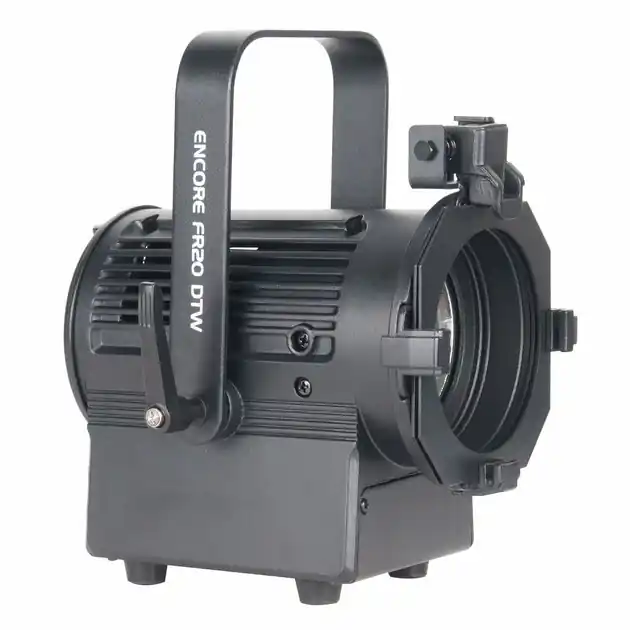 Encore FR20 DTW, člen řady scénických svítidel Encore, je vybaven 2″ fresnelovou čočkou a 17 W bílým LED zdrojem. Vytváří bílý 19° paprsek chromatické teploty 3000 K s měkkými okraji pro jevištní a divadelní použití. Vyzařovací úhel lze pomocí přibalené čočky upravit na 45°.