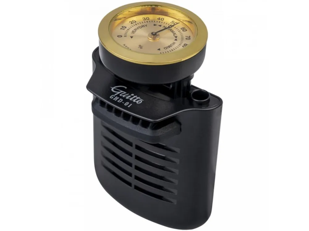 Guitto GHD-01 je zvlhčovač navržený speciálně pro akustické a klasické kytary, díky kterému dokážete přesně sledovat míru vlhkosti a zabránit tak smršťování dřeva a jeho následnému praskání. Většina podobných výrobků na trhu je určena k umístění mezi struny, což vede k nadměrné zátěži kytarového krku. GHD-01 tento problém řeší důmyslným uchycením kapsle s houbičkou k okraji ozvučnice, vaše kytara je tedy efektivně zvlhčována v absolutním bezpečí. K dokonalému přehledu o situaci ve vašem kytarovému kufru slouží přesný ukazatel aktuální vlhkosti.