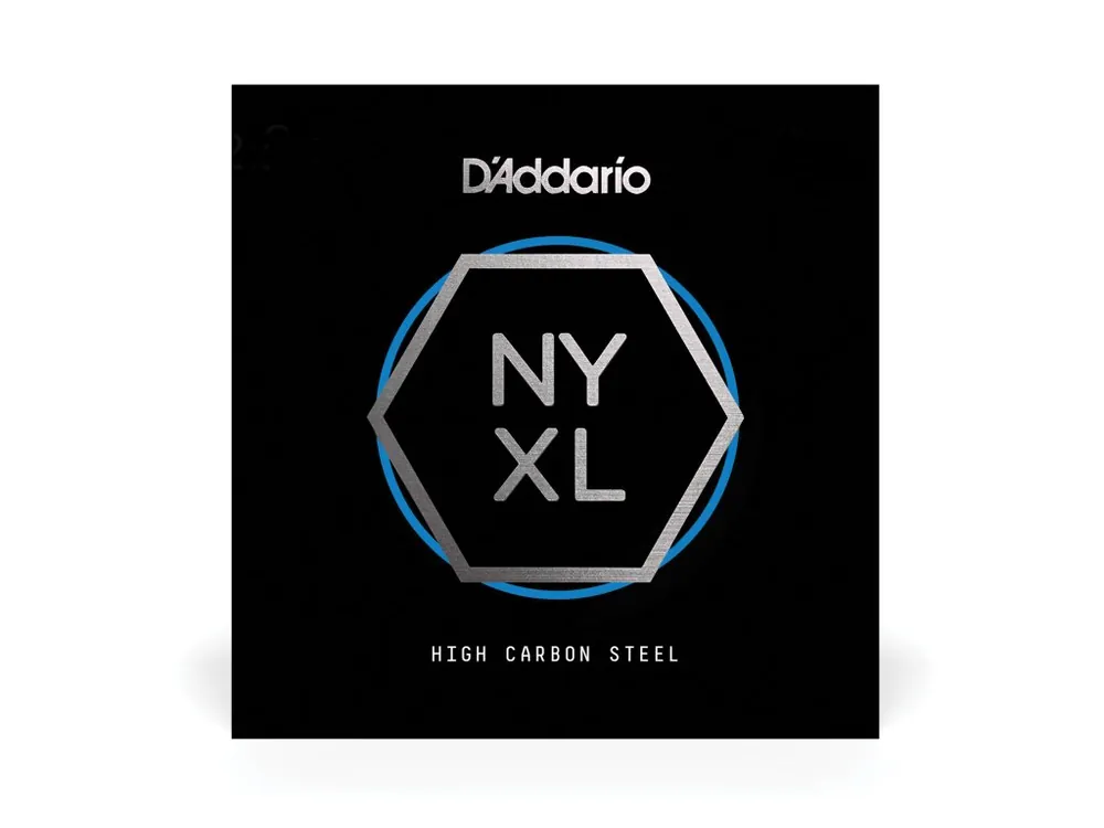 „D’Addario NYXL plain steel guitar strings provide more strength and up to 131% greater tuning stability by utilizing a completely reinvented wire drawing process, coupled with a revolutionary „fusion twist.“