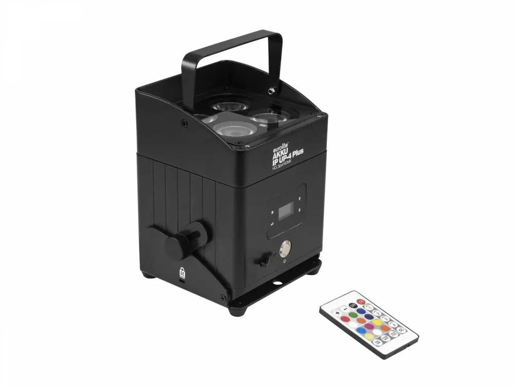 Eurolite AKKU IP UP-4 představuje funkcemi nabitý uplight s vyměnitelnou baterií, RGBAW + UV LED světlami, DMX a dálkovým ovladáním. Je vhodný i pro venkovní použití vzhledem k vysokému ochrannému krytí IP65. O výkon osvětlení se starají čtyři 10W LED lampy, které kombinují RGBAW + UV provedení. Ovládání lze praktikovat zcela bezdrátově díky švédské technologii WDMX, na výběr je pak 49 profesionálních přednastavených programů s různými barevnými tóny a tématy. Přístroj obsahuje i sofistikovanou ochranu proti krádeži Kensigton Security. Pokud vlastníte více uplightů AKKU IP UP-4, mohl by se vám hodit přepravní case, do kterého se vejdou čtyři přístroje a lze v něm nabíjet až osm náhradních baterií (vydrž baterie – až deset hodin nepřetržitého provozu): Výkon: 35W