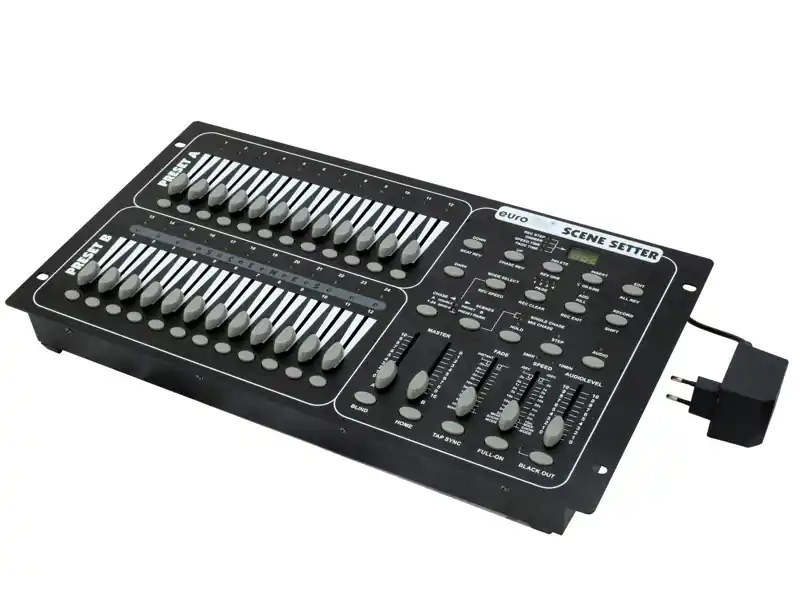 Univerzální 24-kanálový DMX ovládací pult pro řízení stmívačů, stroboskopů, výrobníků mlhy apod. 4 paměťové banky po 12 programech, tedy až 48 různých programů k uložení. Zálohování paměti, funkce Black out, Full on a Blind. Master Dimmer pro stmívání všech kanálů, možnost ovládání hudbou nebo zabudovaným časovačem. Možnost připojení MIDI signálu. Rozměry 483 x 264 x 90 mm, hmotnost 5 kg.
