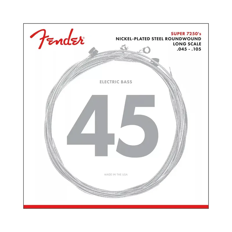 Fender 7250M Super Nickel Plated je sada strun na 4strunnou basovou kytaru. Struny jsou vyrobeny z oceli, která nabízí vysoký výstup a dynamický rozsah, s povrchovým poniklováním, které nabídne příjemný pocit ze hry. Nabízejí jasný a průrazný zvuk a jsou vhodné především pro rock, blues a další podobné žánry. Tloušťka strun je Medium – .045, .065, .085, .105. Zakončení kuličkou. Vyrobeno v USA. Model: 0737250406.