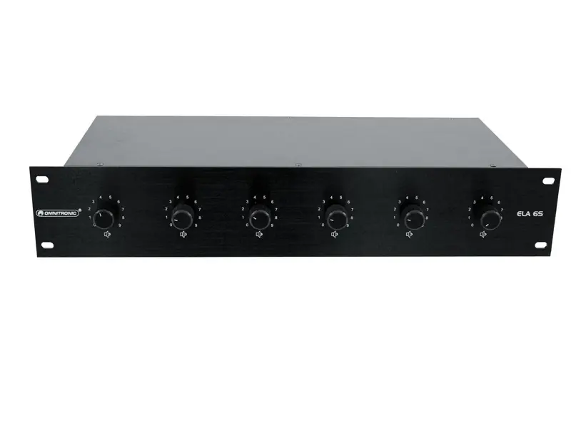 Stereo ovladač hlasitosti pro 6 zón, 4 ohmový vstup stereo zesilovače a 4 ohmový stereo reproduktorový výstup na zónu, útlum v 10 krocích, hliníkový přední panel, šroubové připojení, pro (19″) 48,3 cm instalaci do racku 2 U.
