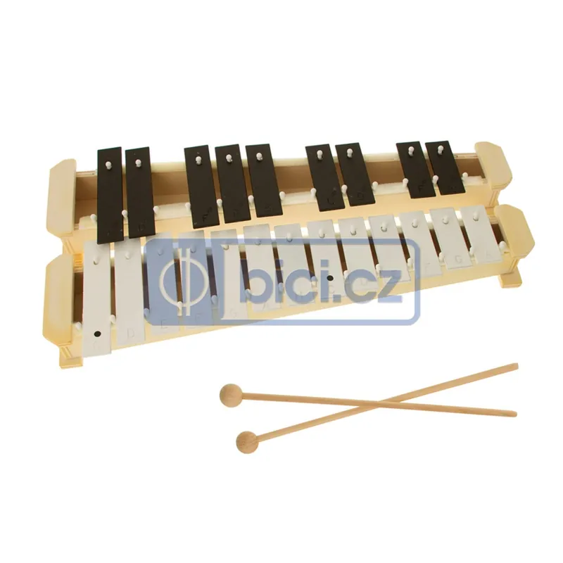 Sopránová zvonkohra českého výrobce, 13 bílých kamenů (c3 až a4) + 9 černých kamenů (Cis až Gis) šíře 25 mm. Rozměry: délka 45 cm. Sada obsahuje i dvě paličky.