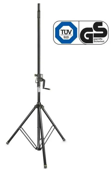 Reproduktorový stojan. Klika pro snadné zvedání a spouštění reproduktorů Variabilní výška od 1,5 m do 2,4 m Nosnost 40 kg. Skládací nožičky stativu pro snadný transport.