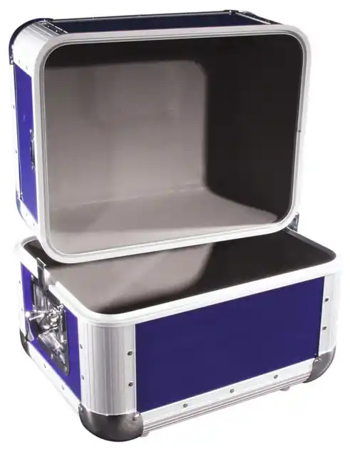 For 80 LPs. Pragmatic 50/50 separation. Interior upholstered with foam (3 mm, gray). Aluminum profile frames (40 mm) with rounded edges. Three-leg, medium sized steel ball corners. 2 lockable high-quality butterfly locks. 8 rubber feet. Rugged carrying handle.