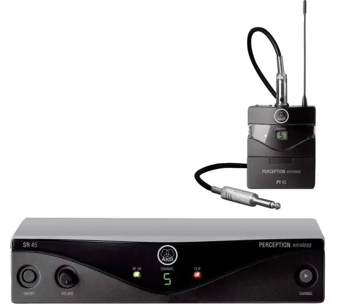 Součástí setu AKG Perception Wireless Instrumental Set je přijímač AKG SR 45 a bodypack AKG PT 45.Přijímač má na svém šasí minimum ovládacích prvků, přesto nenínastavování parametrů nijak ochuzeno. K ovládání slouží potenciometrVolume, tlačítko Channel pro přepínání kanálů, LED displej zobrazujícízvolený kanál, LED indikátory signálu a clippingu, vypínač a trimr pronastavení squelche. Výstupy jsou osazeny XLR a ¼“ Jack konektory.Bodypack PT 45 je vůbec nejmenším a nejlehčím vysílačem ve své třídě akromě toho je kompatibilní s miniaturními mikrofony AKG MicroMics, kteréumožňují kvalitní ozvučení všech běžných nástrojů. PT 45 je vybavendisplejem, LED indikátorem stavu baterie a vypínačem, pod krytkoubaterie najdeme přepínač kanálů a trimr pro nastavení vstupní úrovně.Bodypack je napájen jednou AA baterií, na níž dosahuje životnosti až 10 hodin.