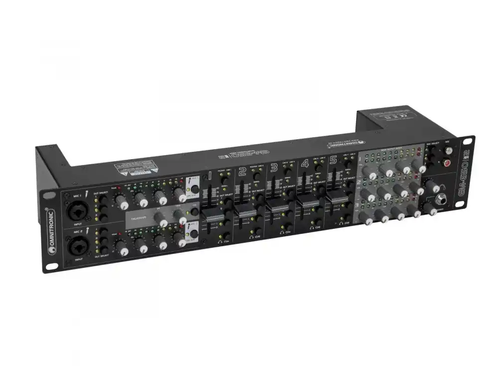 Multifunkční 5+2 kanálový mixážní pult se 3 zónami, 5 vstupních kanálů s ovládáním zisku na zadním panelu, signální LED, hladké fadery, dva samostatné mikrofonní kanály s ovládáním úrovně, 3-pásmový ekvalizér, tlačítko s funkcí Talkover, nastavitelná úroveň a doba odezvy, odposlech vstupních kanálů a hlavního výstupu přes nastavitelný výstup sluchátek s funkcí cue mix/split, 3 nastavitelné hlavní výstupy s 3-pásmovým ekvalizérem a 10-ti místným stereo LED měřičem úrovně, 2 záznamové výstupy (nezávislé na hlavních kanálech) s vypínačem pro mikrofonní signál, 9 linkových vstupů a 2 linkové/phono vstupy přes RCA konektory, 2 mikrofonní vstupy přes kombinované zásuvky Jack 6,3 mm/XLR, 3 hlavní výstupy (volitelně XLR/RCA) a 2 záznamové výstupy přes RCA konektory, (19″) instalace do racku 48,3 cm, výška 2U.