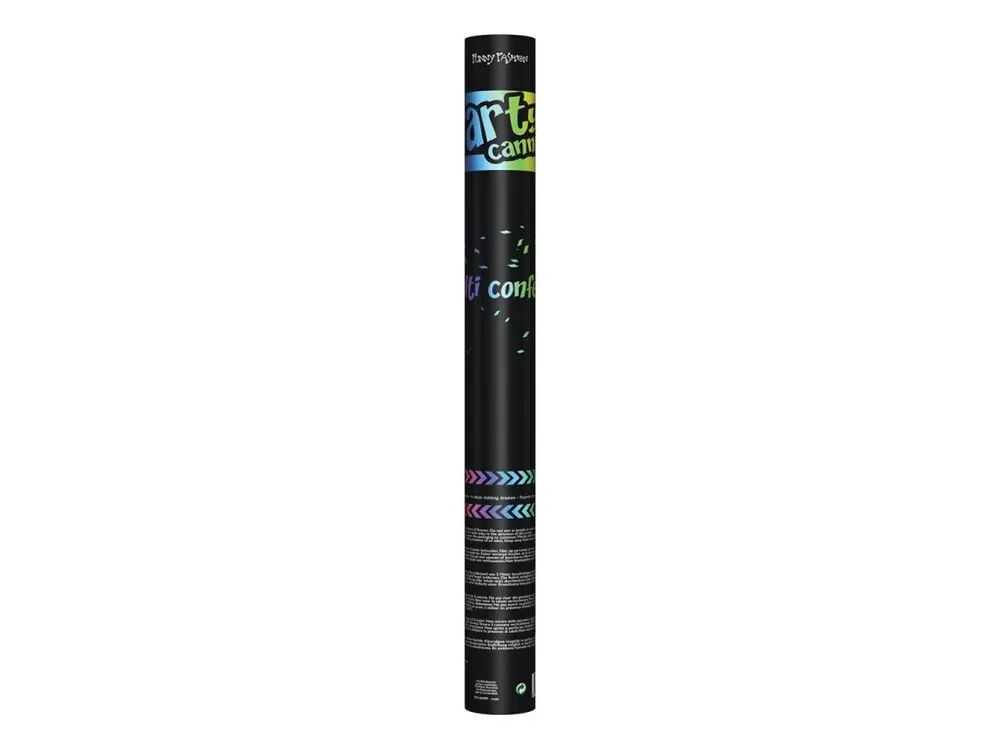 Papírové obdélníkové konfety v kartonovém 60 cm tubusu, vystřelované stlačeným vzduchem pootočením spodní části tubusu ve směru šipek. Nemiřte na lidi. Dodržujte bezpečnou vzdálenost 5 m. Vhodné pro použití v exteriéru i interiéru.