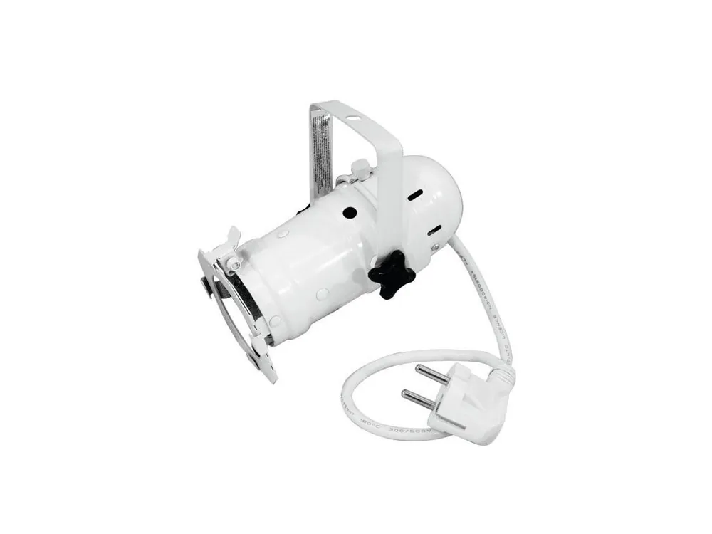 Mini bodové spoty PAR 16 pro světelné zdroje s paticí GU-10 a maximálním výkonem 75W. Délka reflektoru cca. 15cm, dodáváno vč. závěsného držáku, rámečku na barevné filtry a přívodního kabelu (230V). Bílé barevné provedení.