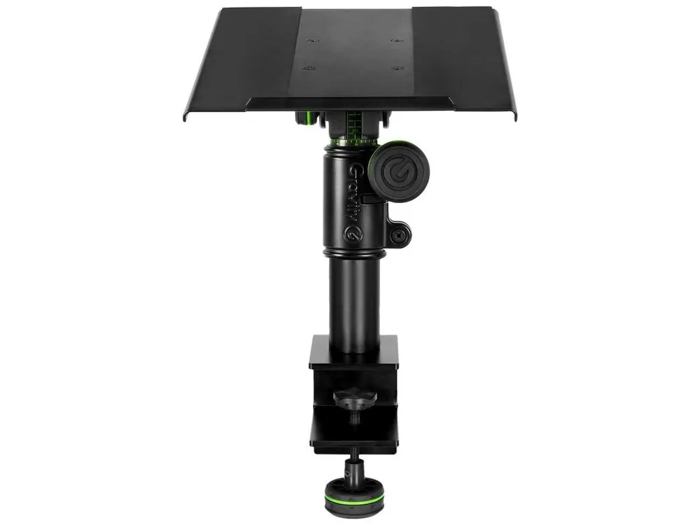 Společnost Gravity se se všemi těmito problémy vypořádala s modelem SP 3102 TM. Stojan pro studiové monitory je vybaven stolní svorkou pro bezpečné a spolehlivé připevnění konstrukce ke stolům s deskou o tloušťce nejvýše 100 mm. Stejně jako ostatní výrobky Gravity ji lze utáhnout pomocí robustního a praktického knoflíku. Na rozdíl od běžných stolních stojanů, které vyžadují velkou základovou desku, aby se nepohnula, má základna svorky SP 3102 TM rozměry pouze 10 × 7 cm a nezabírá více místa než standardní držák obrazovky. Konstrukce stojanů studiových monitorů zajišťuje, že příliš nevyčnívají ze stolu. Tím je zajištěna větší vzdálenost mezi posluchačem a monitory, i když stoly nejsou tak hluboké, a také dokonalé umístění reproduktorů, abyste našli „sweet spot“ v místnosti.