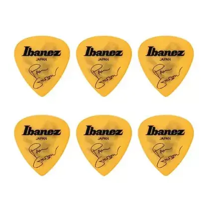 Sada 6 trsátek Ibanez o tloušťce 1 mm v jedinečném signovaném designu navržené virtuózním kytaristou Paulem Gilbertem. Tato kvalitní trsátka ve tvaru preferovaného samotným Johnem nesou na jedné straně kytaristův podpis s logem Ibanez a na druhé straně Paulův autoportrét Tato žlutá trsátka jsou vyrobena v Japonsku a díky svému tvaru, tloušťce i materiálu jsou perfektní pro jakýkoli styl hry.