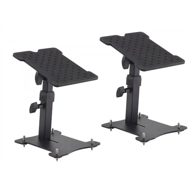 Univerzální stolní stojan vhodný pro studiové monitory a reproduktory. Stojan disponuje podstavcem s pogumovaným povrchem, nastavitelnou výškou a sklonem pro detailní nastavení monitoru při nahrávání, mixu, kritickým poslechu nebo finálním masteringu. Součástí balení jsou čtyři gumové podstavce a kovové jehlany pro nastavení roviny.