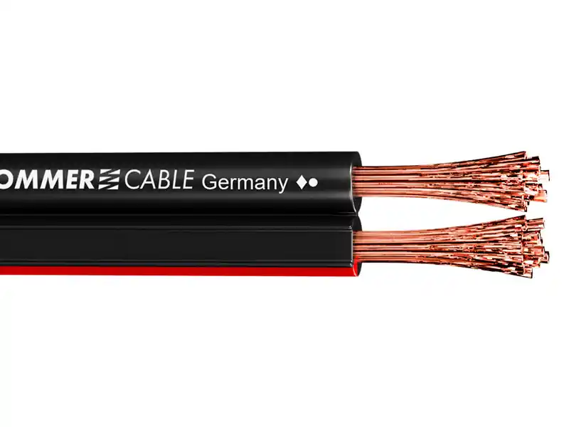 Reproduktorový plochý kabel (dvojlinka) NYFAZ 2x4mm, vodiče jsou složeny z extrémně jemného spletení 226×0,15mm. Barva černá. Hmotnost 1m 101g. Určeno pro pevné instalace, hifi spojení.