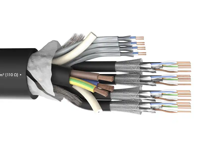 MONOCAT POWER 414 PVC s integrovaným 4x CAT6 datového kabelu, 4x DMX kabelu a 1x silového kabelu 3×2,5mm. Kabel je vhodný pro mobilní a instalační aparáty